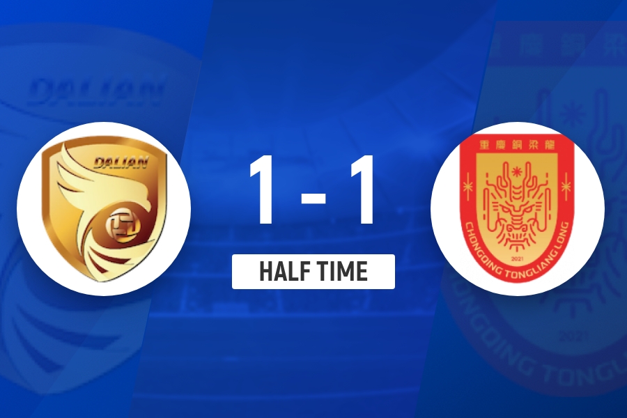 上半场赛事 结束,大连鲲城1-1重庆铜梁龙。
