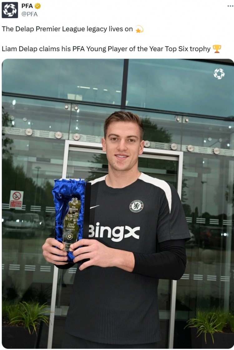 10月7日讯 切尔西球员德拉普此前荣膺PFA年度最佳年轻球员前6,PFA官推也晒出球员领取奖杯的照片。