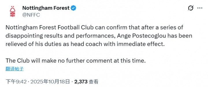 诺丁汉森林古代足球 俱乐部可以确认,由于近期一系列令人失望的赛事 结果与场上表现,安格·波斯特科格鲁已立即不再担任球队主指导教练员一职。