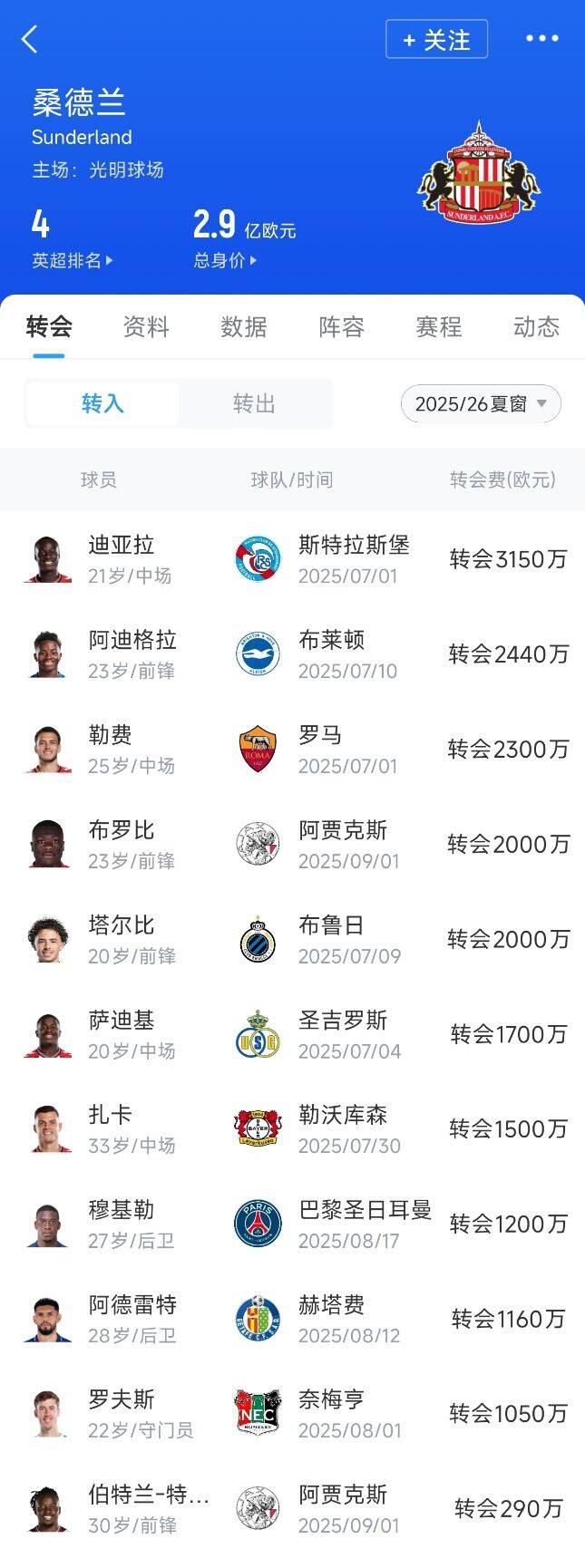 桑德兰夏窗引援:不含租借