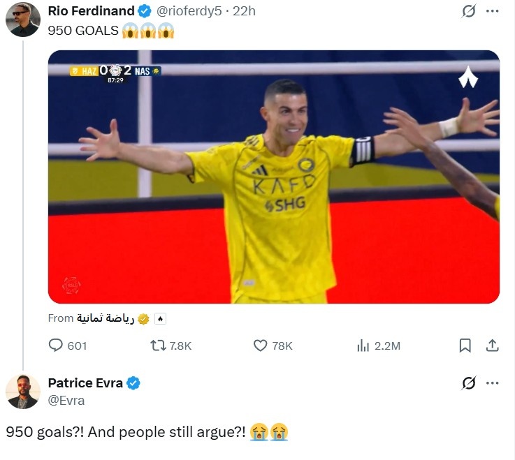 C罗的曼联老队友费迪南德晒出C罗得分 片段,并感叹:950球了啊!
