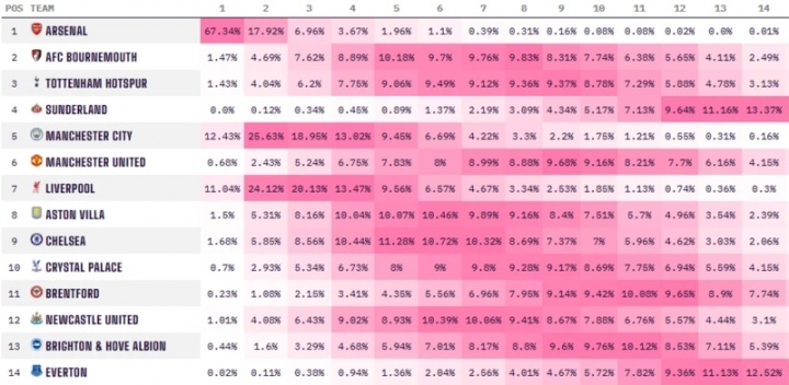 此外,切尔西目前的夺魁 概率为1.68%,热刺为1.43%,曼联0.68%。