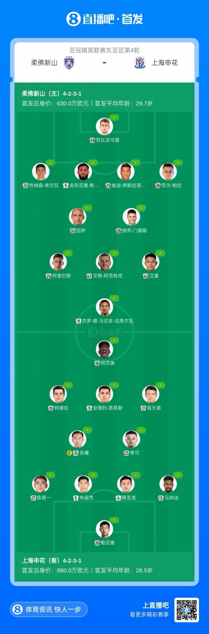 上海申花杆位:30-鲍亚雄、4-蒋圣龙、5-朱辰杰、13-马纳法、27-陈晋一、15-吴曦、17-高天意、23-李可、10-特谢拉、19-阿苏埃、9-安德烈·路易斯